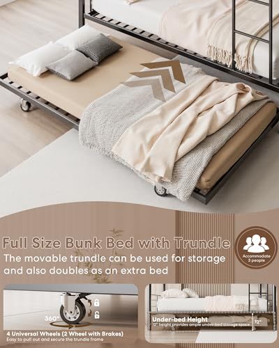 Mixcous Full Over Full Bunk Bed with Trundle, Heavy Duty Metal Bed Frame with Full-Length Guardrails & Ladder, 3-in-1 Convertible Full Bunk Bed, Noise-Free, No Box Spring Needed, Black